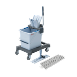 Starterskit bevat: 25 ltr. emmer, hendelpers, mopframe, MicroSpeed Max mop en een onderstel met wielen (excl. steel !).